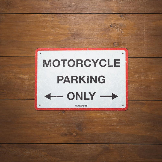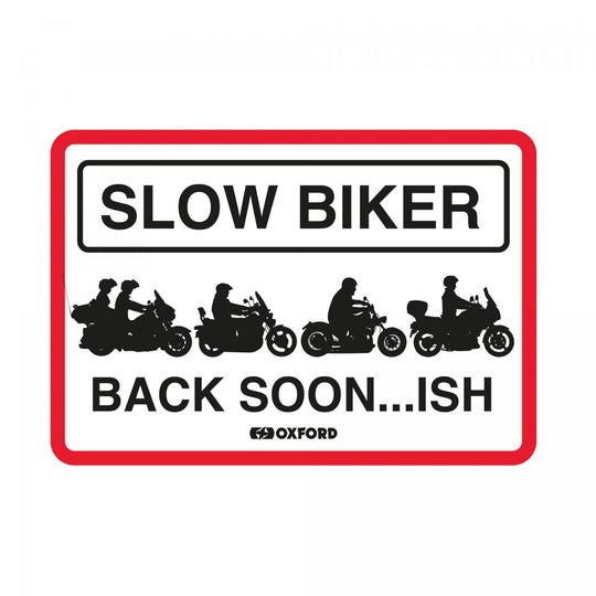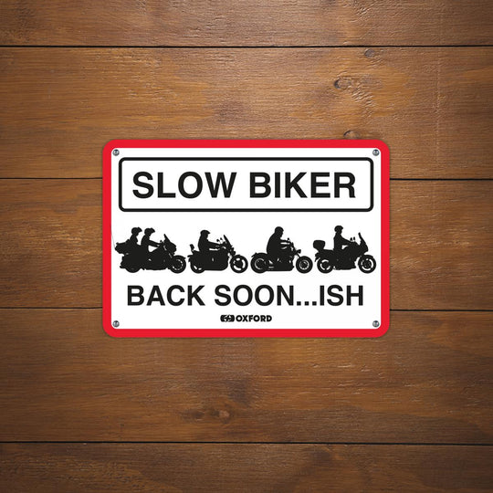 Metallskylt Oxford Garage: Slow Biker tillbaka snart