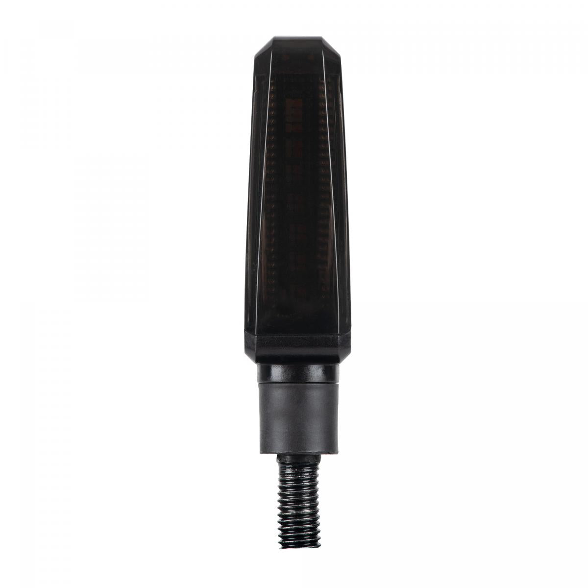 Den ultimata trickuppgraderingen – nu med en mörkrökad lins. När den aktiveras sveper blinkersen dynamiskt över från insidan till utsidan av blinkersremsan. En universell passform gör dessa till ett måste för alla motorcyklar. Viktiga funktioner – 9 lysdioder inkapslade i ett tåligt, mattsvart hölje med rökfärgad lins – Sekventiella strömmande blinkers – Universell passform – Vattentät design – För användning fram eller bak – Spänning 12V Effekt 4W – M8-bult – gängstigning 1,25 – E-märkt för vägbruk – Säljs som ett par Storlek: 96 mm (L) x 19 mm (B) x 20 mm (D) Vad som ingår – En höger och en vänster blinkers för användning fram eller bak – 2 motstånd för att reglera blinkningsfrekvensen