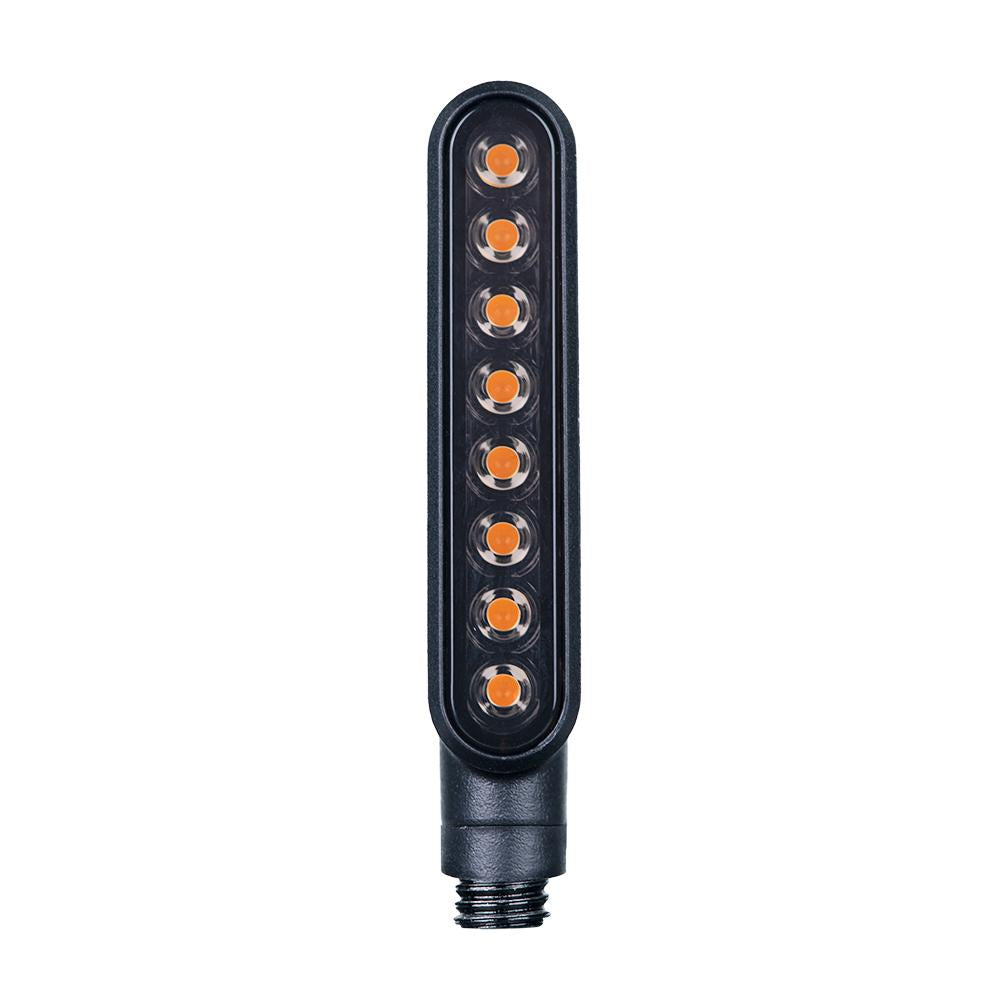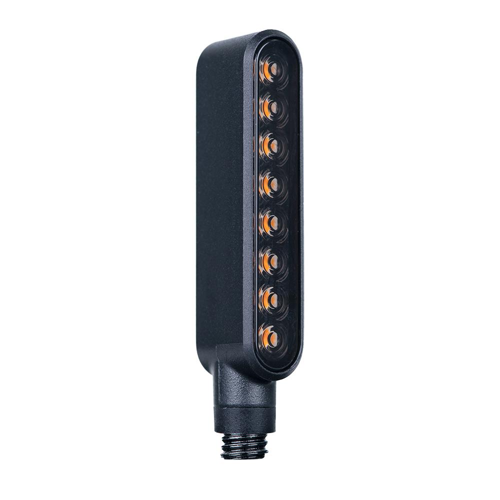 Den ultimata trickuppgraderingen. När den aktiveras sveper blinkersen dynamiskt över från insidan till utsidan av blinkersremsan. Viktiga funktioner - Universell passform - Vattentät design - Premiumkvalitet, robust, mattsvart ABS-hölje - Paketet innehåller en höger och en vänster blinkers (för användning fram eller bak) - 8 lysdioder bakom en rökfärgad lins - E-märkt, för vägbruk - Spänning 12V Effekt 6W - M8-bult - gängstigning 1,25 Storlek: 75 mm (L) x 12 mm (B), 15 mm (D) Vad som ingår - En höger och en vänster blinkers (för användning fram eller bak) - 2 motstånd för att reglera blixtfrekvensen