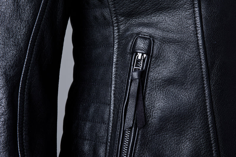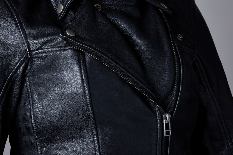Ripley 2 är en specialdesignad klassisk skinnjacka för kvinnor, tillverkad av supermjukt anilinläder. Den har ett svart satinfoder som gör att du ser snygg ut både på och utanför cykeln, samtidigt som den ger dig det CE-godkända skydd du behöver.