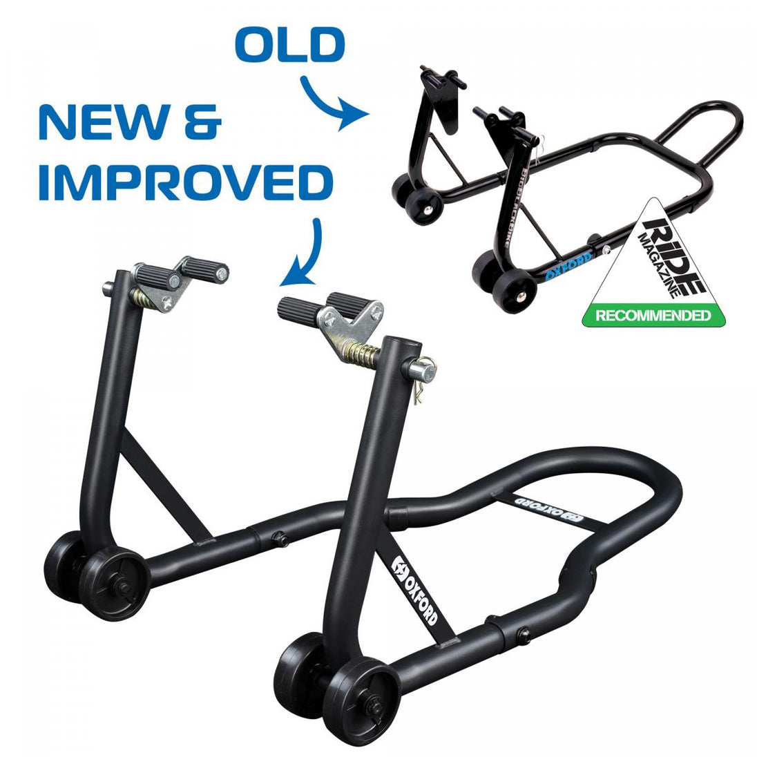 Black Front Paddock Stand 2.0 är en oumbärlig utrustningsdel för alla hemmamekaniker. Den slitstarka stålkonstruktionen hos denna främre paddockställning, kraftiga fästelement och dubbla hjul för maximal stabilitet gör detta till en oumbärlig utrustningsdel för alla hemmamekaniker. Viktiga funktioner - Slitstark stålkonstruktion - Kraftiga fästelement för maximal styvhet - Vridstöd för ökad stabilitet - Dubbla hjul för smidig lyftning och maximal stabilitet under belastning - Maxbelastning: 250 kg - Stativets vikt: 4,9 kg - Lyfthöjd: 315 mm (stiftcentrum) - Black Front Paddock Stand 2.0 ersätter original SP822-versionen (RiDE rekommenderas) Reservdelskoder - Lyftgafflar: För stativ med blå Oxford-logotyper (fyrkantigt rör) finns inga reservdelar tillgängliga. För stativ med vita Oxford-logotyper (runda rör) använd kod OX290.