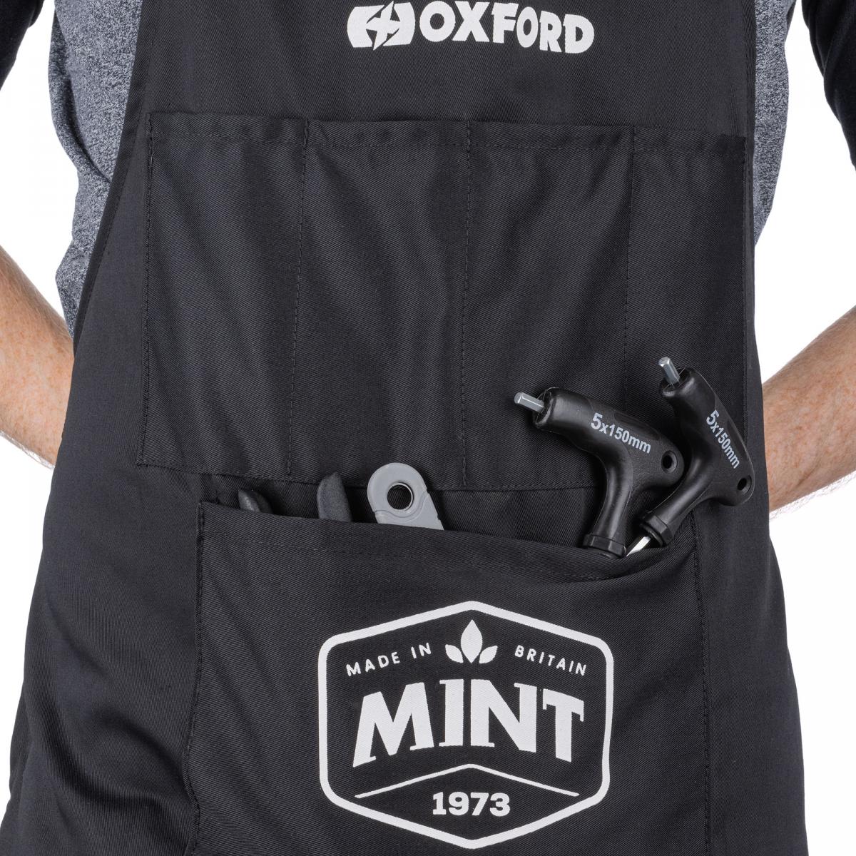 Oxford Mint Workshop Apron är ett måste för alla cykelälskare. Du kan inte bara ha dina verktyg nära till hands i dess flera fickor, det skyddar också dina kläder från oönskade spill eller stänk som uppstår när du arbetar på din cykel. Förklädet har en justerbar midjerem med spänne, vilket gör det enkelt att ta på och av, och har fem fickor för förvaring av verktyg. Viktiga funktioner - Universell passform - Justerbar midje- och nackrem - Flera fickor - 65 % polyester, 35 % bomull