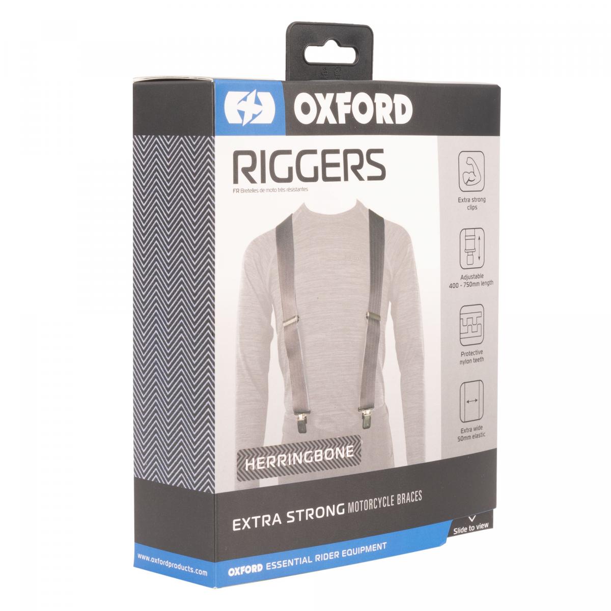 Oxford Riggers är superstarka och finns nu i en rad nya utföranden. Viktiga funktioner - Nylontänder som skyddar kläderna mot fasthakning - Extra starka klämmor - Justerbar storlek - 400–750 mm längd - Extra bred 50 mm resår - Material: 80 % resår, 15 % metall och 5 % PU