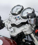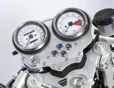 Detta snygga tillbehör är tillverkat av aluminium. Den övre delen är ytbehandlad i borstad aluminium och den nedre fästena är svartanodiserad för en snygg, ren och hållbar finish. Nyckelns placering har flyttats upp på instrumentpanelen och rattarna har placerats på en plattare profil för en mer retro look. Passar Triumph Thruxton (04-07).