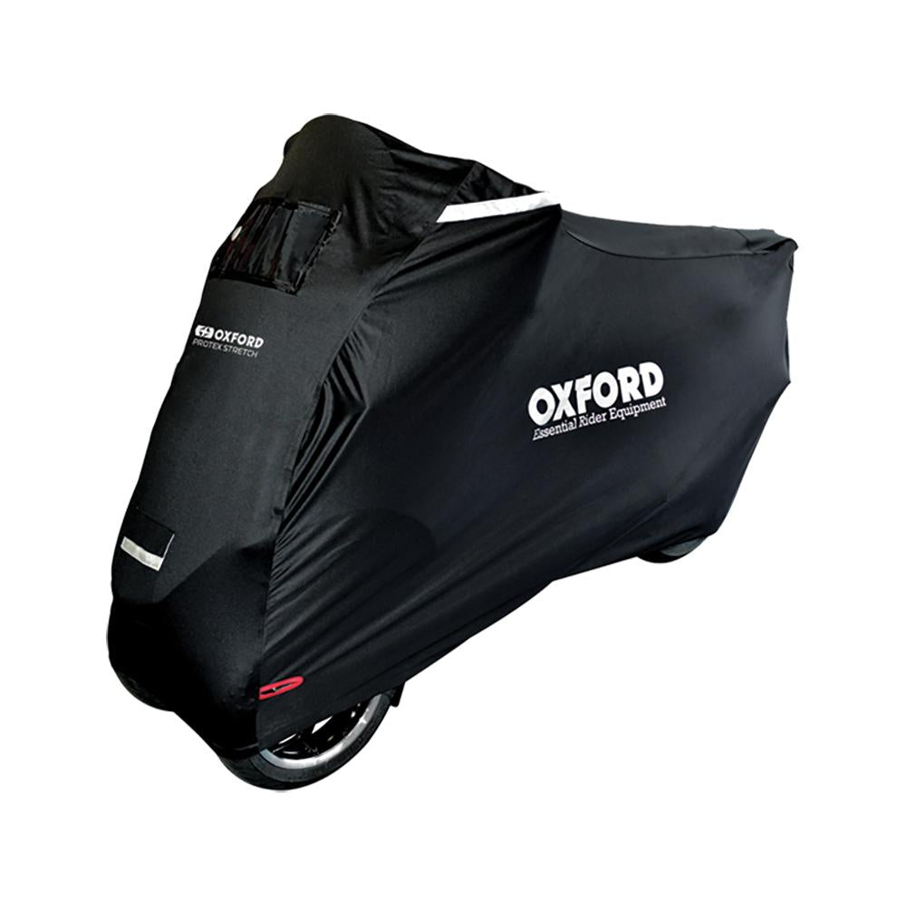 Oxford Protex Stretch-överdraget är ett premiumöverdrag med stretch. Överdraget är ett utomhusöverdrag som erbjuder skydd mot regn, sol, snö och damm. Det är utrustat med ett PVC-fönster för att hålla en solpanelsladdare. Lokala polisinitiativ har visat att cykelöverdrag kan vara en användbar stöldskyddsanordning – om en tjuv inte kan se vilken typ av motorcykel som finns under är det mindre sannolikt att de siktar på den. Kombinera med ett av våra prisbelönta kedje- eller skivlås med inbyggt larm för att lägga till ett extra lager av försvar mot potentiella cykeltjuvar. Viktiga funktioner - Låsfickor (fram och bak) håller ditt hänglås borta från marken - Vattentåliga sömmar - Mjukt foder skyddar mot repor - Ventilerade för att minska kondens - Reflekterande paneler och logotyper ökar synligheten på natten - Slitstarkt 3-lagersmaterial skyddar mot väder och lätta stötar - Resår i botten och justerbar magrem håller skyddet på plats - Strategiskt placerade hål underlättar användningen av ett lås (fram och bak) - Genomskinligt fönster för Oxford Solariser-batteriladdare - Bakre fönster för att visa registreringsskylten (valfritt) - Finns i 5 storlekar (se storlekar nedan) inklusive MP3/3 Wheeler VIKTIGT: Låt inte detta skydd komma i kontakt med heta avgasrör, motordelar eller vassa föremål. Storlekar Följande storlekar är ungefärliga, eftersom skydden är formade: - - MP3 220 cm (längd) X 77,5 cm (bredd) X 130 cm (höjd)