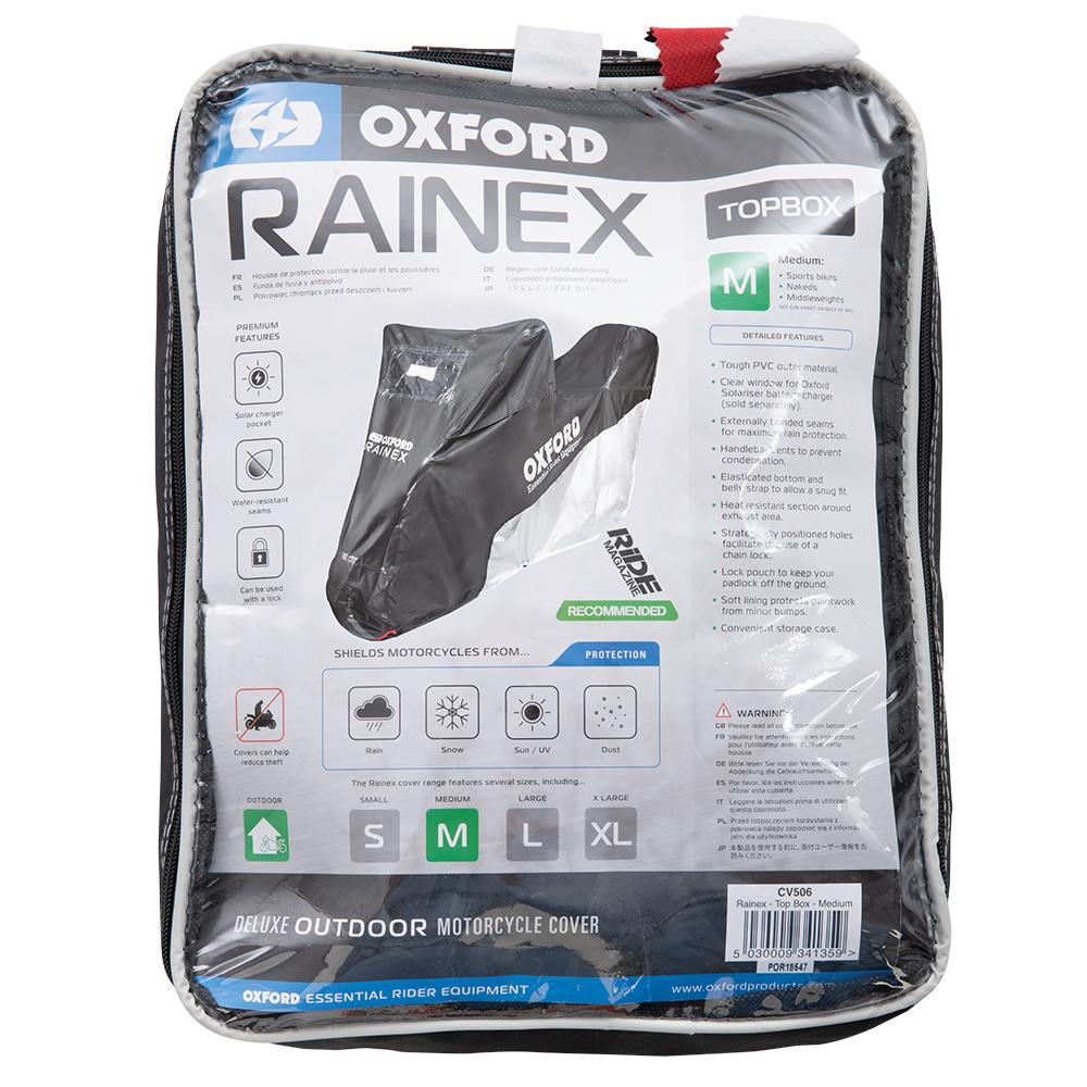 Oxford Rainex Top Box är ett lyxigt regn- och dammskydd. Designat för utomhusbruk skyddar det mot regn, sol, snö och damm. Rainex Top Box är fullpackad med funktioner, inklusive en ficka för solcellsladdning, vattenavvisande sömmar och rekommenderas av tidningen RiDE. Lokala polisinitiativ har visat att cykelskydd kan vara en användbar stöldskyddsanordning – om en tjuv inte kan se vilken typ av motorcykel som finns under är det mindre sannolikt att de siktar på den. Kombinera med ett av våra prisbelönta kedje- eller skivlås med inbyggt larm för att lägga till ett extra lager av försvar mot potentiella cykeltjuvar. Viktiga funktioner - Utvändigt bundna sömmar för maximalt regnskydd - Ventilationsöppningar i styret förhindrar kondens - Slitstarkt yttre material skyddar mot väder och stötar - Mjukt foder skyddar mot repor - Reflekterande paneler ökar synligheten på natten - Justerbar magrem håller den på plats - Värmebeständigt fodermaterial vid tillfällig kontakt med avgasröret - Strategiskt placerade hål underlättar användningen av en låsficka som hjälper till att hålla hänglåset borta från marken - Passar över alla Oxford-toppboxar - Innerficka fram med PVC-fönster för att förvara en solpanelsladdare VIKTIGT: Låt inte detta skydd komma i kontakt med varma avgasrör, motordelar eller vassa föremål. Storlekar Följande storlekar är ungefärliga, eftersom överdragen är formade: - Liten 203 cm (längd) x 83 cm (bredd) x 119 cm (höjd) - Medium 229 cm (längd) x 99 cm (bredd) x 125 cm (höjd) - Stor 246 cm (längd) x 104 cm (bredd) x 127 cm (höjd) - Extra stor 277 cm (längd) x 104 cm (bredd) x 141 cm (höjd) Recensioner Om du tar av överdraget efter en natt med kraftigt regn kommer du verkligen att se en torr motorcykel vänta på dig. - visordown.com Läs hela recensionen