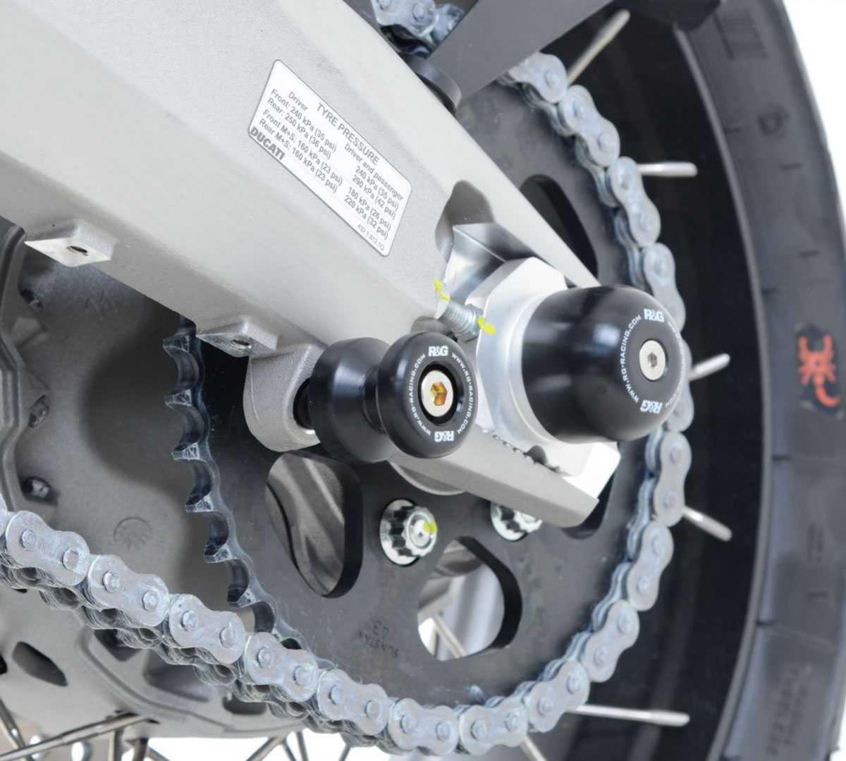 Är det bomullsrullar eller spindelglidare? Ja, båda är det verkligen!! Bomullsrullen skyddar svingarmen och svingarmens kärnkomponenter vid en krock eller ett fall, men fungerar även som spolar för paddockstället. Den gör att motorcykelns bakhjul kan lyftas upp i luften via ett paddockställ för kedjejustering, däckbyten och rengöring! Detta specifika par R&G bomullsrullar är kompatibla med Ducati Hypermotard 698 Mono24-, Multistrada V2(S) 22-24, Ducati Multistrada 1200 Enduro modell 16, Multistrada 950 17-21 950S 19-21 och Ducati Multistrada V4(S) 21-24, Energica EGO EGO+ EGO+RS och EVA RIBELLE RS och EVA ESSEESSE9 9+ +RS 21. Kontrollera din svingarm för gängade klackar som passar dessa bomullsrullar. Vissa marknader för 2017 har inte dessa muttrar. Observera: Svingarmsskydd (visas genom den bakre spindeln) INGÅR INTE men finns tillgängliga separat (SKU: SP0054BK).