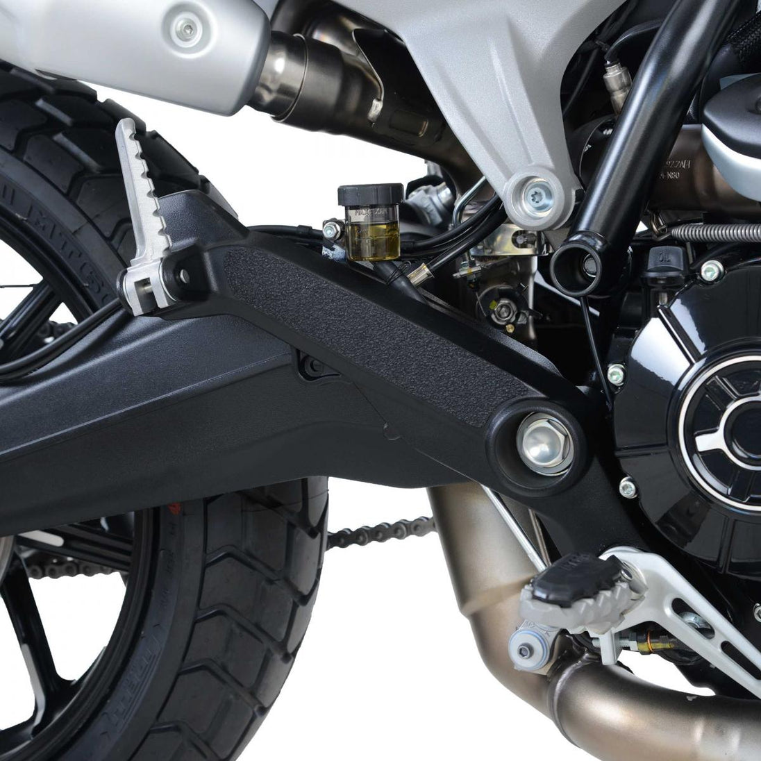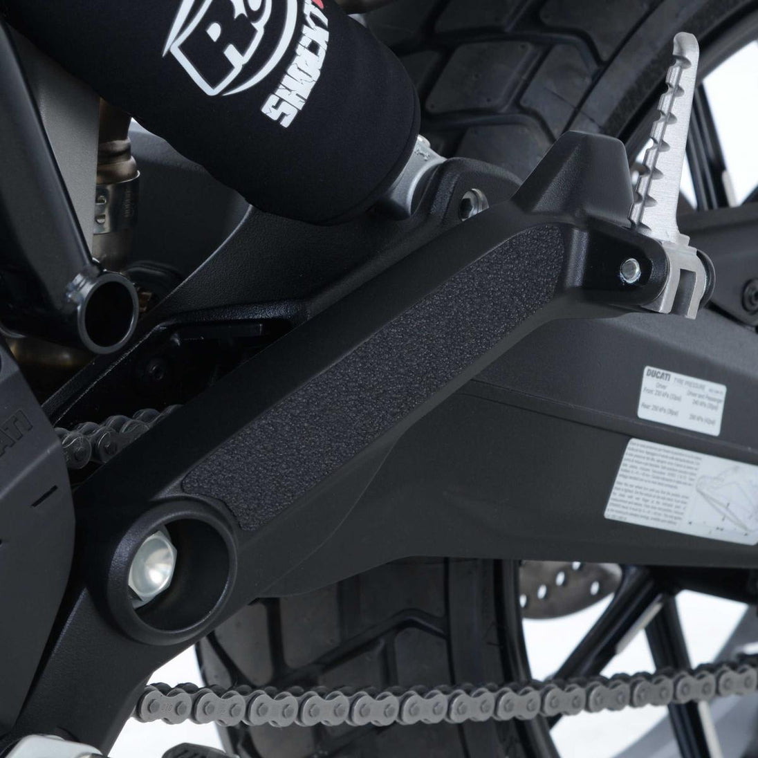 Detta tvådelade stövelskyddskit har specialdesignats för Ducati Scrambler 1100 18-modellerna. R&G:s stövelskyddskit finns tillgängliga för en mängd olika motorcykelstilar och märken, med nya applikationer som regelbundet släpps. Den unika R&G-strukturen har specialdesignats för att vara hållbar och ger föraren en buffert mellan stöveln och de exponerade områdena på ramen, svängarmen och de områden som (ibland) kan komma i kontakt med varandra under kurvtagning, vilket orsakar slitage och oönskade skador på svängarmen eller stövlarna (båda dyra att reparera!). Tillverkad i Storbritannien.
