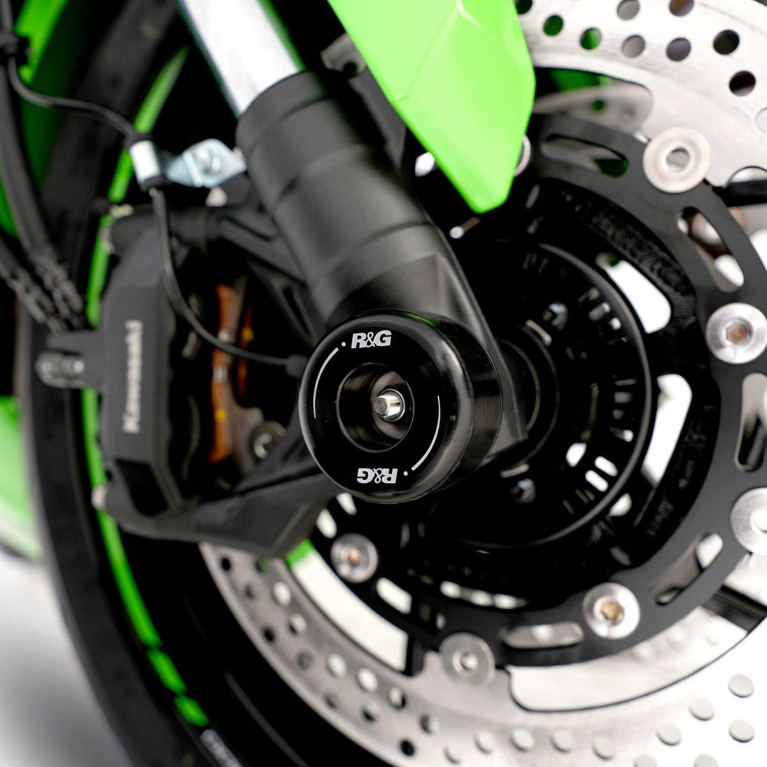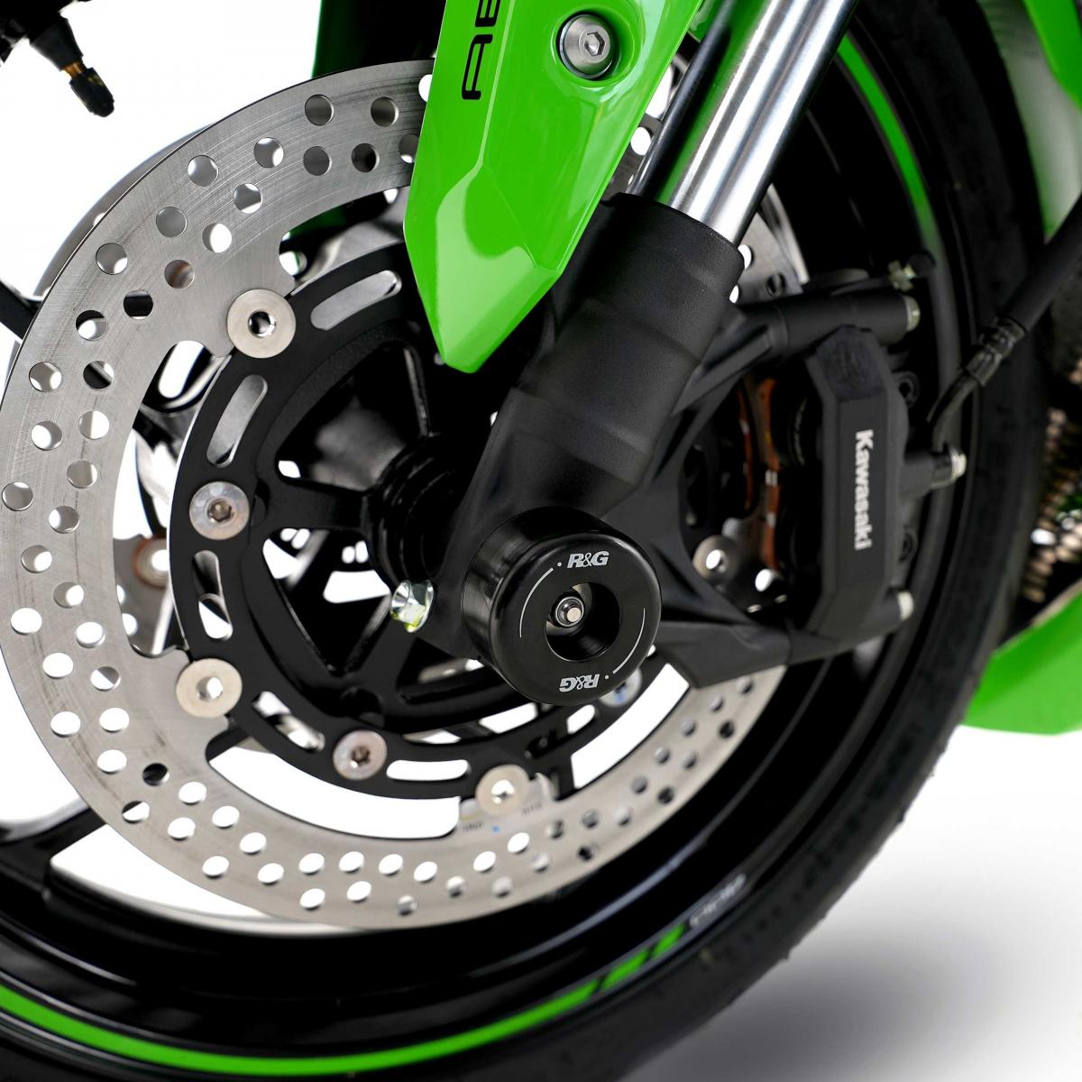 De är enkla att installera och hjälper till att eliminera skador på framgaffeln, gaffelbottnarna och bromsoken vid en krock eller fall. Dessa gaffelskydd passar Kawasaki ZX-25R 20- och ZX-4R(R) (SE) 23-modellen.