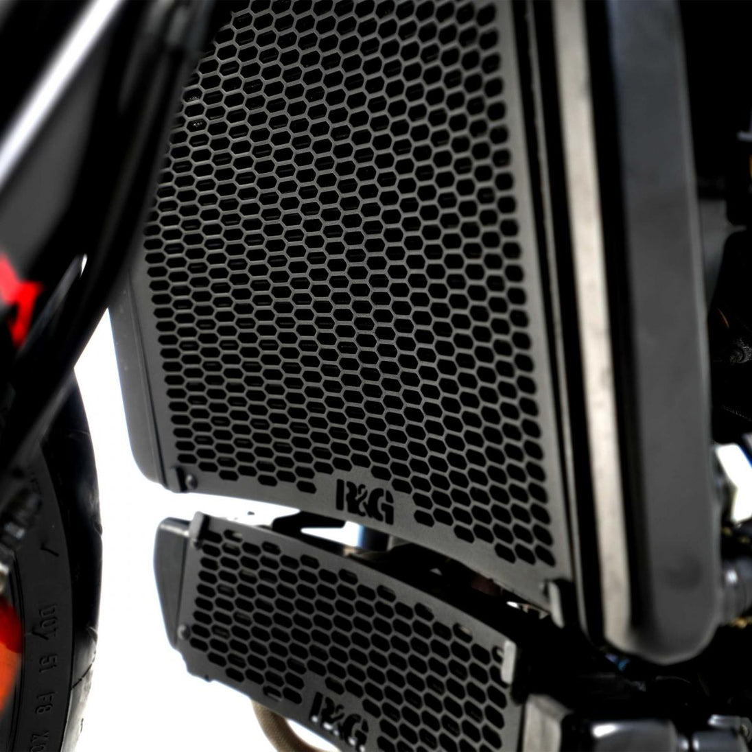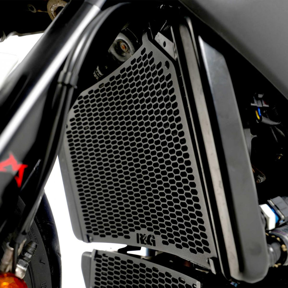 Våra Pro-kylarskydd har en ny geometrisk "hexa"-design som erbjuder ett seriöst skydd för dina ömtåliga kylare utan att begränsa prestanda eller luftflöde. R&G PRO-kylarskydd är gjorda av ett enda stycke högkvalitativ lättviktsaluminium och erbjuder ett oslagbart förhållande mellan styrka och vikt. Den laserskurna designen är modern och kompletterar alla motorcykellook. Dessutom är R&G PRO-kylarskydden korrosionsbeständiga tack vare den slående, texturerade, matta pulverlackeringen.