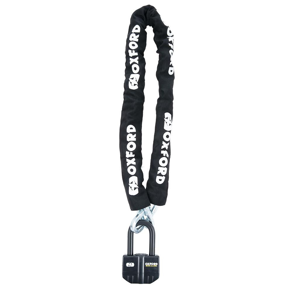 Detta kedjelås har Oxfords starkaste lås någonsin med inbyggt larm. Hänglåset har en 16 mm bygel och ett öronbedövande högt 100bB-larm som utlöses av rörelsesensorer (hänglåset kan också aktiveras utan att larmet ställs in). Kombinerat med en 12 mm härdad stålkedja, tillgänglig i 3 längder, kommer Boss Alarm-kedjelåset att avskräcka alla blivande cykeltjuvar. Oxford Boss Alarm-kedjelåset har testats och godkänts oberoende av Sold Secure och har tilldelats Powered Cycle (Motorcycle) GOLD-standarden, SBSC och ART 4*. Försäkringsrabatter finns tillgängliga i Storbritannien när du använder detta lås. Detta lås har en nyckelbytestjänst. När du köper ditt lås, anteckna helt enkelt numret som antingen är fäst vid nycklarna på en metalletikett eller är lasermärkt på varje nyckel. Hänglås - Anfallstestat och motståndskraftigt mot slägga, såg, bultsax och borr. - Schackelsäkra designen tål 4,5 ton dragbelastning. - Den avtagbara, förseglade larmmodulen är vibrationstålig och väderbeständig mot vatten, frost och värme. - Mycket högljutt 100 dB larm. - Kan användas som skivlås eller hänglås. - Tre nycklar och ersättningsnyckel ingår. - Batterier ingår (6 x LR44). - Kombinera med 12 mm härdad stålkedja för extra säkerhet. Kedja - 12 mm fyrkantskedja tillverkad av Ni-Cro-Mo-legerat stål. - Sethärdad kedja för att motstå bultsaxar. - Zinkbelagd för att förhindra korrosion. - Skyddande tyghylsa för att förhindra skador och göra den lättare att hantera. - Långa länkar minskar vikten och ökar portabiliteten. - Passar alla Oxford-markankare. - Kan enkelt förvaras under sätet. - Finns i tre längder: 1,2 m, 1,5 m och 2,0 m.