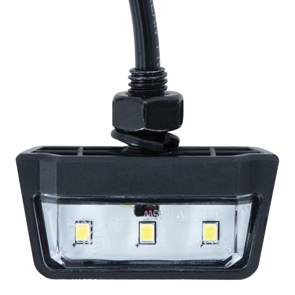Halo LED-skyltbelysning. Viktiga funktioner - 3 lysdioder i ett hölje med matt baksida - E-märkt, lämplig för vägkörning - Universell passform, enkel att installera - Vattentät design med IP-klassning X7 - Specifikation: 12V, 0,45W - M8-bult - gängstigning 1,25 Storlek: 24 mm (H) x 50 mm (B) x 15 mm (D)