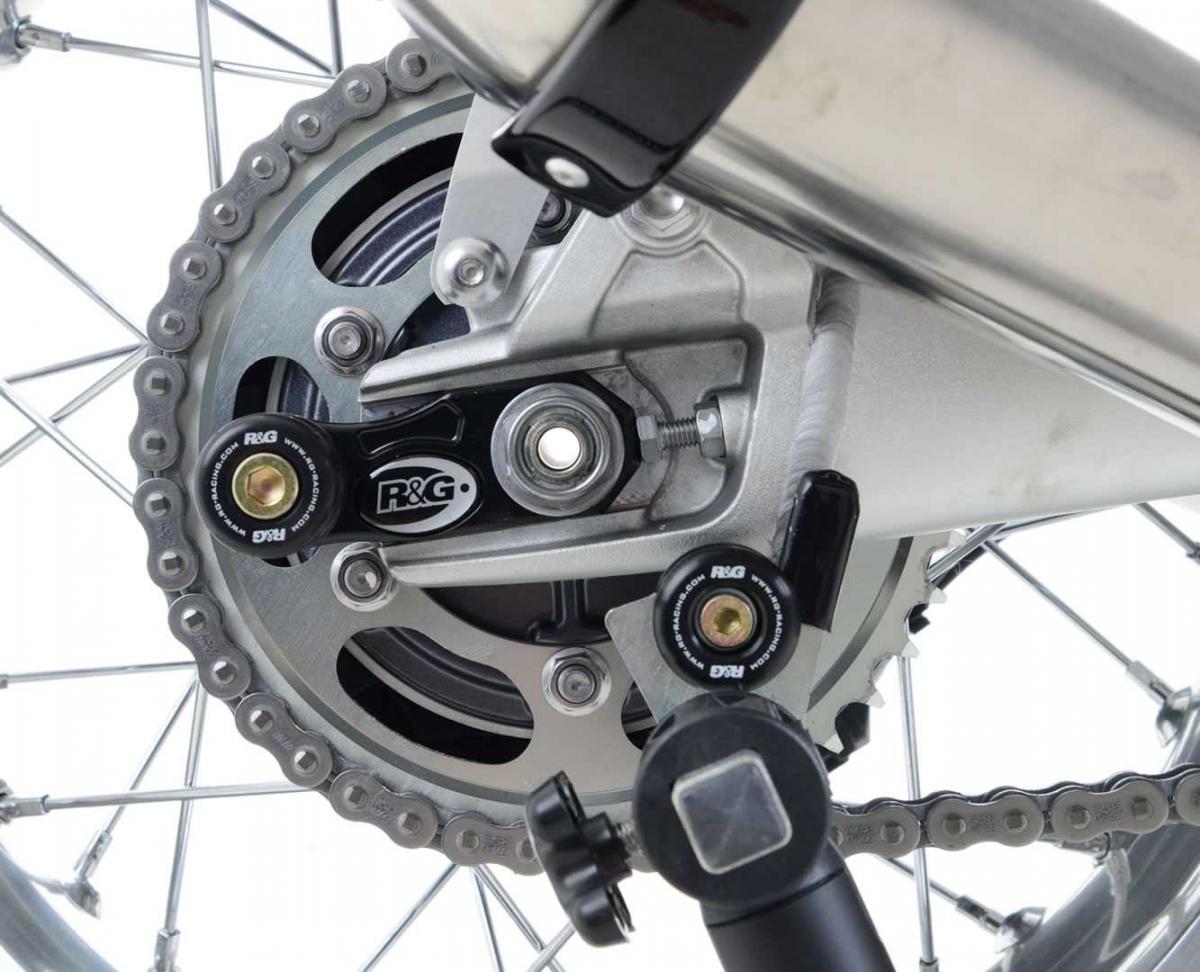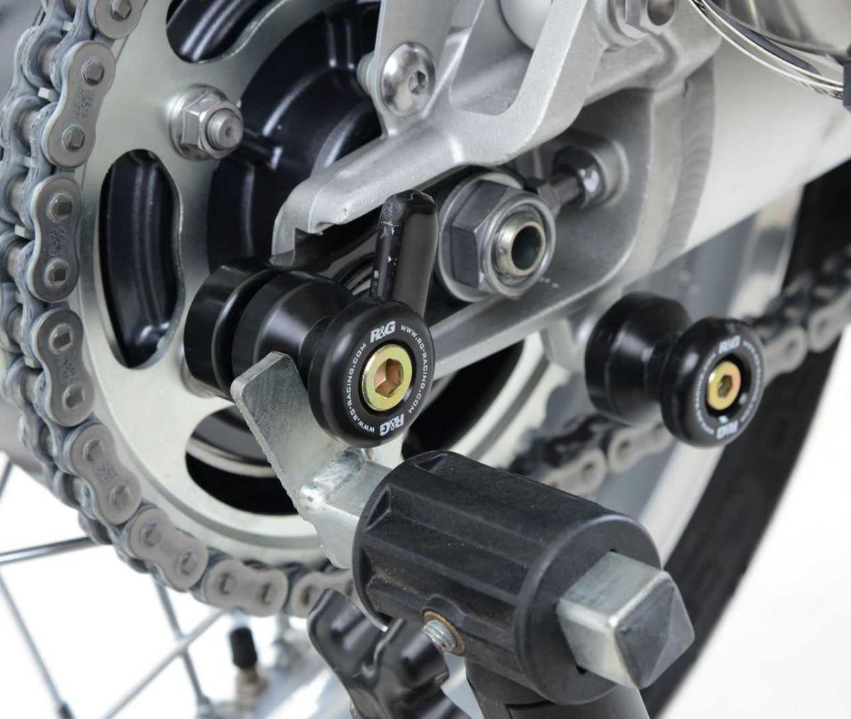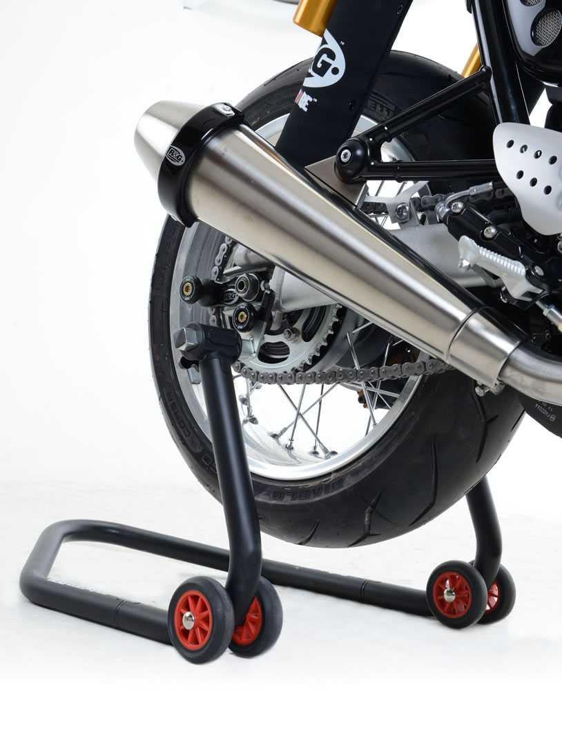 R&G Offset-bomullsrullar ersätter direkt de originalkedjejusterarna på den bakre svingarmen, och förskjuter bomullsrullens monteringspunkt från att vara installerad direkt i svingarmen, utan istället placeras i ett specialbearbetat metallfäste. Erbjuder det bästa av två världar när det gäller krockskydd och funktionalitet med möjligheten att använda R&G Offset Cotton Reels-spolar som spolar till paddockstand, för underhåll och däckbyten samt erbjuder krockskydd för bakhjulskomponenterna. Speciellt utformade för Triumph Street Twin 16-, Thruxton 1200 R 16-, Speed ​​Twin 1200 19-21, Scrambler 1200 XCXE 19- och Speed ​​Twin 900 22- modellerna. Dessa Offset Cotton Reels är utformade för att ersätta OEM-kedjejusterblocken, vilket förskjuter bomullsrullens installationspunkt ytterligare bakåt. Detta beror på att OEMAftermarket-avgasrören under extrema körförhållanden har varit kända för att träffa en standardstor (traditionellt svingarmsmonterad) bomullsrulle. Finns endast i SVART - Säljs parvis.