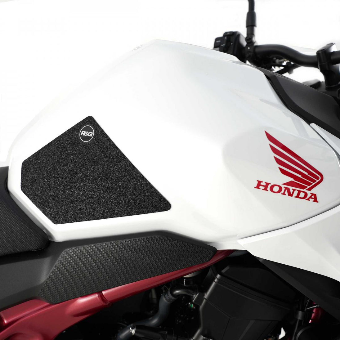 Dessa tvådelade R&G Tank Traction Grips har specialdesignats för Honda CB750 Hornet 23-modellen. R&G Tank Traction Grips-kit finns tillgängliga för många olika motorcykelstilar och märken, och nya applikationer släpps regelbundet. Den unika R&G-strukturen har specialdesignats för att vara både mjuk och hållbar, vilket ger föraren det grepp och den känsla hen behöver för bättre kontroll över motorcykeln, vilket gör att föraren kan bibehålla en stabil kroppsposition vid kurvtagning och inbromsning.