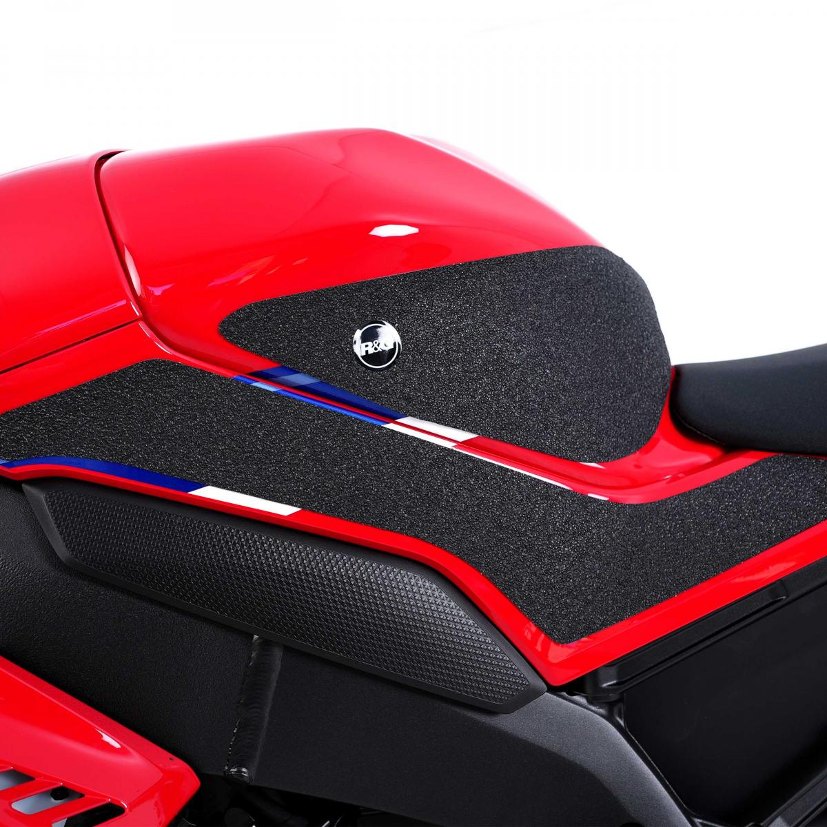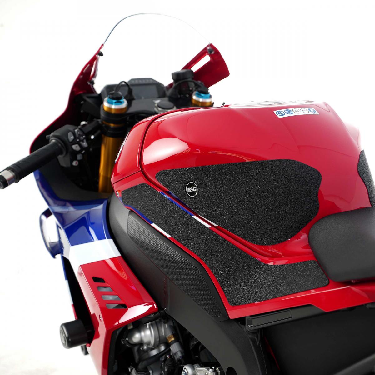 Dessa 4-delade R&G Tank Traction Grips har specialdesignats för Honda CBR1000RR-R FirebladeSP 20-modellen. R&G Tank Traction Grip-kit finns tillgängliga för många olika motorcykelstilar och märken, med nya applikationer som regelbundet släpps. Den unika R&G-strukturen har specialdesignats för att vara både mjuk och hållbar, vilket ger föraren det grepp och den känsla hen behöver för bättre kontroll över motorcykeln, vilket gör att föraren kan bibehålla en stabil kroppsposition vid kurvtagning och inbromsning.