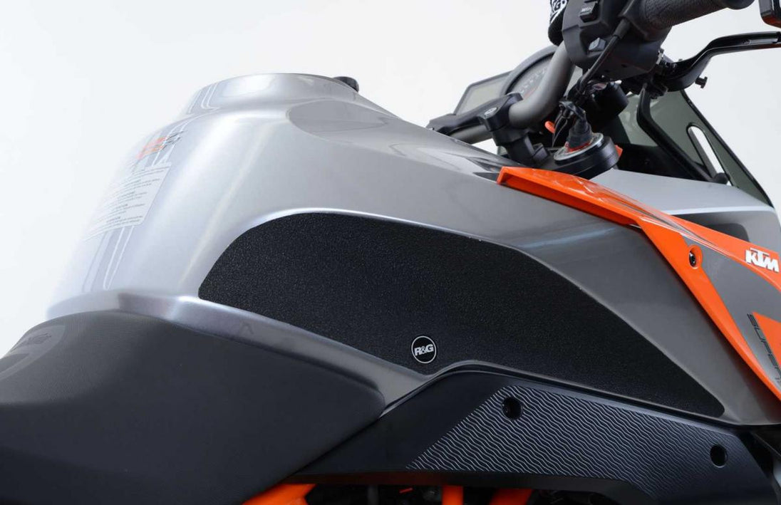 Dessa R&G Tank Traction Grips har specialdesignats för KTM Superduke GT 16-18. R&G Tank Traction Grip-kit finns tillgängliga för många olika motorcykelstilar och märken, med nya applikationer som regelbundet släpps. Den unika R&G Traction Grip-strukturen har specialdesignats för att vara både mjuk och hållbar, vilket ger föraren det grepp och den känsla hen behöver för att få bättre kontroll över motorcykeln, vilket gör att föraren kan bibehålla en stabil kroppsposition vid kurvtagning och inbromsning. Observera: R&G Tank Traction Grips levereras nu med ett självhäftande emblem med 25 mm diameter. Tillverkat i Storbritannien.