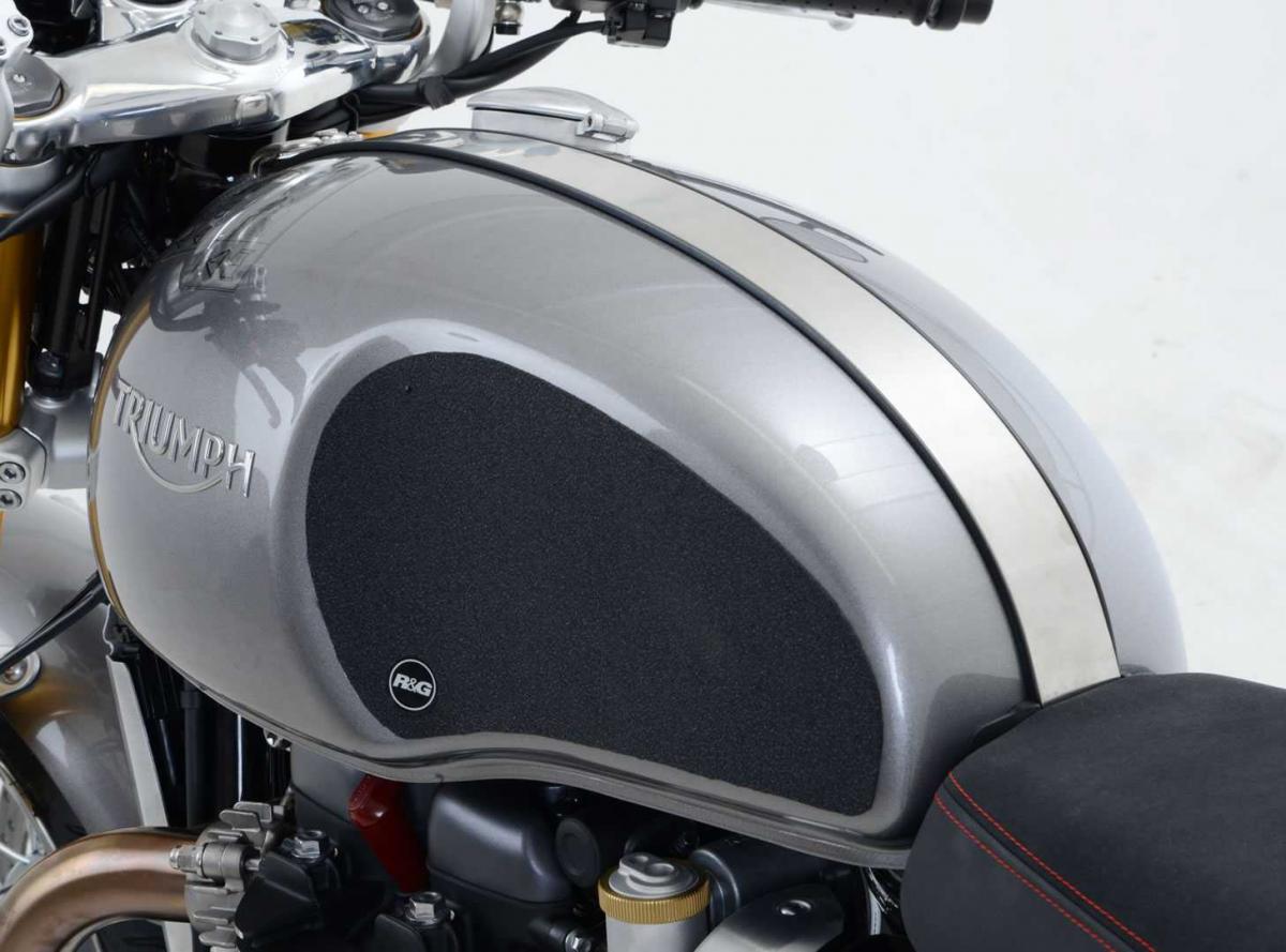 Dessa R&G Tank Traction Grips har specialdesignats för Triumph Thruxton 1200 och 1200R 16-. R&G Tank Traction Grips-kit finns tillgängliga för många olika motorcykelstilar och märken, och nya applikationer släpps regelbundet. Den unika R&G Traction Grip-strukturen har specialdesignats för att vara både mjuk och hållbar, vilket ger föraren det grepp och den känsla hen behöver för att få bättre kontroll över motorcykeln, vilket gör att föraren kan bibehålla en stabil kroppsposition vid kurvtagning och inbromsning. Observera: R&G Tank Traction Grips levereras nu med ett självhäftande emblem med 25 mm diameter. Tillverkat i Storbritannien.