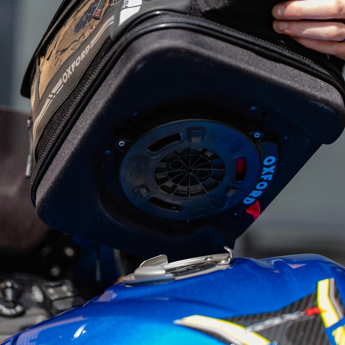 Tankväska med snabbkoppling, 18 liters kapacitet. Viktiga funktioner - Slitstarkt yttre lager i ripstopnylon - Duschtåligt innerfoder (avtagbart) - Reflekterande tryck - Utvändig ficka - Bärhandtag - Säkerhetsremmar för huvuddocka (måste användas) - Snabbkopplingsmekanism QR-ringadapter säljs separat - Speciellt skulpterad form för äventyrsmotorcykelns tank - Avtagbar bas - Inkluderar 5 personliga färginsatser Storlek: 17 cm (H) x 28 cm (B) x 25 cm (D)