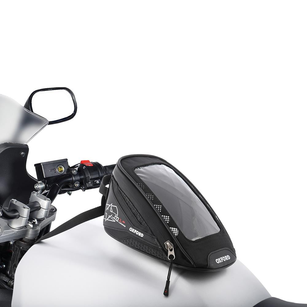 M1R är Oxfords minsta tankväska någonsin och erbjuder precis tillräckligt med utrymme för dina nödvändigheter på vägen: telefon, plånbok, visirrengöring, öronproppar etc. Dess lilla storlek gör att den passar alla motorcyklar med ståltank. Viktiga funktioner - Magnetisk tankväska med 1 liters kapacitet - Livstidsgaranti mot felaktiga material eller tillverkningsfel - Tillverkad av lätt men mycket tålig 420D ripstop-nylon - Vattentålig dragkedja - Bärhandtag och säkerhetsrem för huvudet (måste användas) - Stor genomskinlig ficka för både GPS och smartphones med antireflexskydd - Fickstorlek ca: 10 cm x 17,5 cm - Vattentålig elektrisk utgång - Finns i svart, rött och blått Storlek: 14 cm (H) x 18 cm (B) x 24 cm (L)