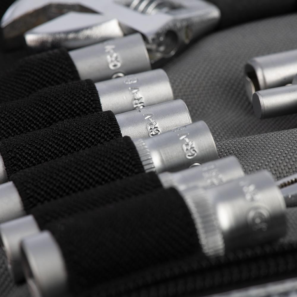 Oxfords Toolstash är en kompakt verktygsrulle som består av 34 elastiska verktygsfack. Den är tillverkad av slitstark 600D PVC-baksida av polyester. Viktiga funktioner - Vadderad konstruktion i 3 lager - Förstärkt fönsterficka för synliga extratillbehör - Stålöljetter för att underlätta upphängning i verkstad - Kompressionsremmar med kardborreband och förstärkningar. Mått - 150 X 285 mm (Stängd) - 575 X 285 mm (Öppen) Observera att verktyg ej ingår.