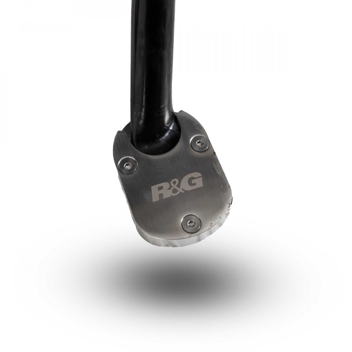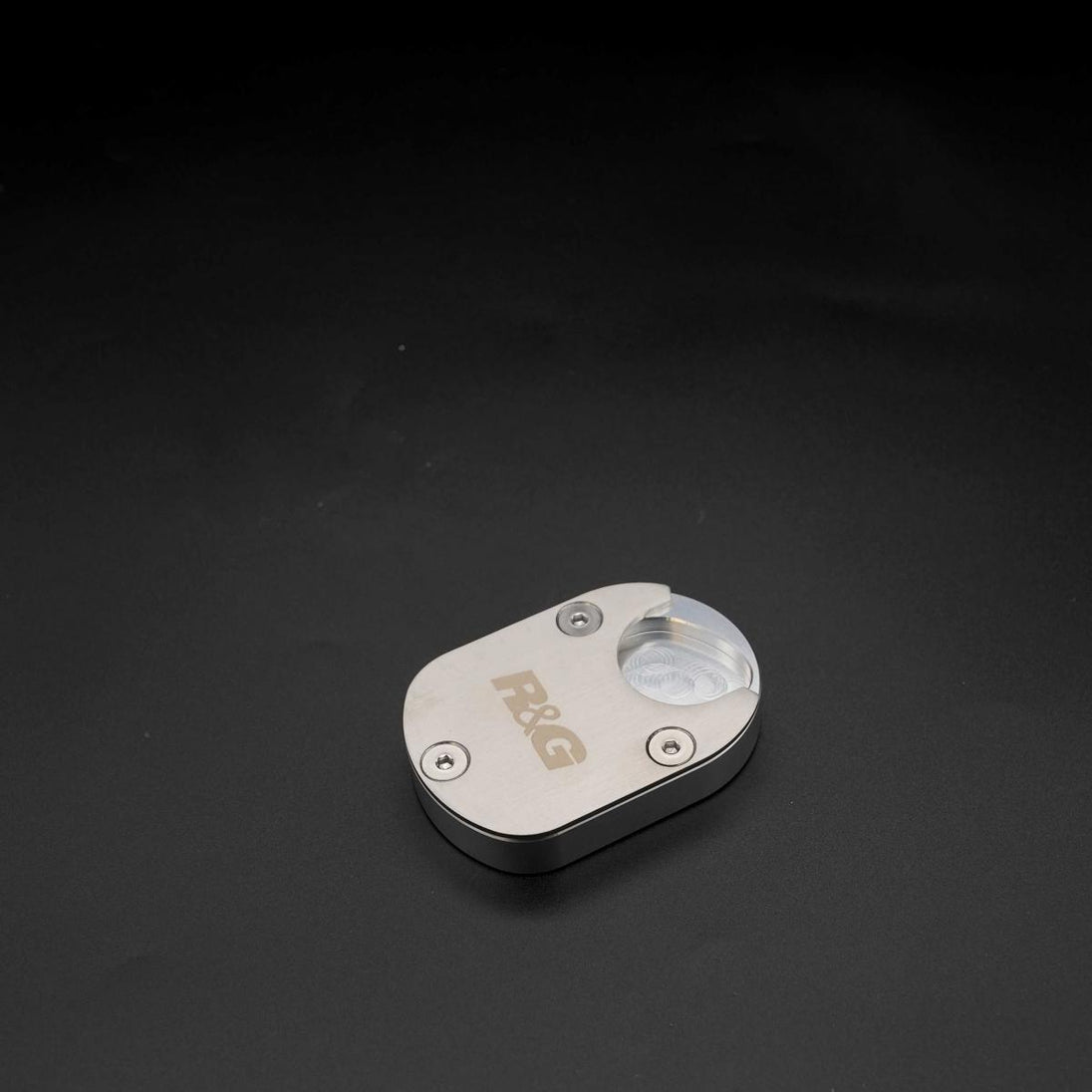 Glöm aldrig din sidostödspuck igen! Stödskorna bultas fast på undersidan av sidostödet för att förstora originalets yta med upp till 100 %, vilket avsevärt fördelar belastningen på dem och hjälper till att förhindra att stödet "tränger igenom" marken. Trots denna förstoring påverkar inte skon markfrigången eller stör kedjegången under normal körning.
