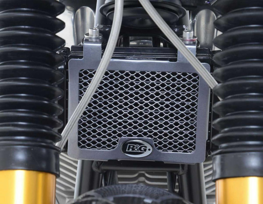 Detta R&G-oljekylarskydd finns tillgängligt med svart eller titanpulverlackering. De är tillverkade av pressat aluminium och har en snygg, sömlös ram. De förbättrar utseendet på din motorcykel och hjälper till att skydda din dyra och känsliga oljekylare från flygande skräp. Detta oljekylarskydd är lämpligt för den exponerade frontmonterade oljekylaren på Norton Commando 961 alla modeller 15-21.