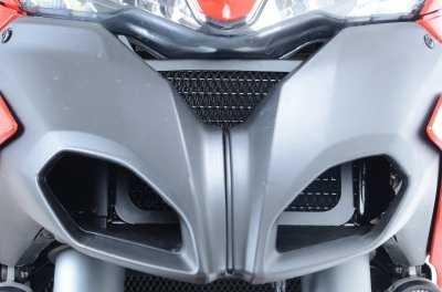 R&G oljekylarskydd finns i pulverlackerad svart eller röd finish. De är tillverkade av pressat aluminium och har en snygg, sömlös ram. De förbättrar utseendet på din motorcykel och hjälper till att skydda din dyra och sårbara oljekylare från flygande skräp. Inga permanenta modifieringar behöver göras på motorcykeln. Detta oljekylarskydd är lämpligt för den nosmonterade kylaren som finns på Ducati Multistrada 1200 10-14.