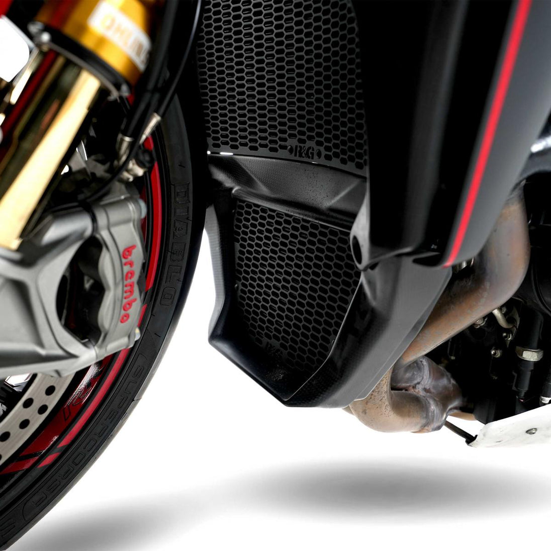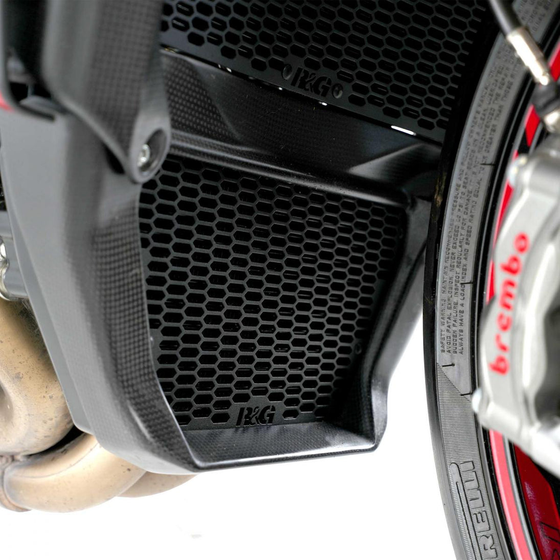 Våra PRO-oljekylarskydd har en ny geometrisk "hexa"-design som ger bättre luftflöde. R&G PRO-oljekylarskydd är tillverkade av ett enda stycke högkvalitativ lättviktsaluminium och erbjuder ett oslagbart förhållande mellan styrka och vikt. MV Agusta Brutale 1000RS 24-