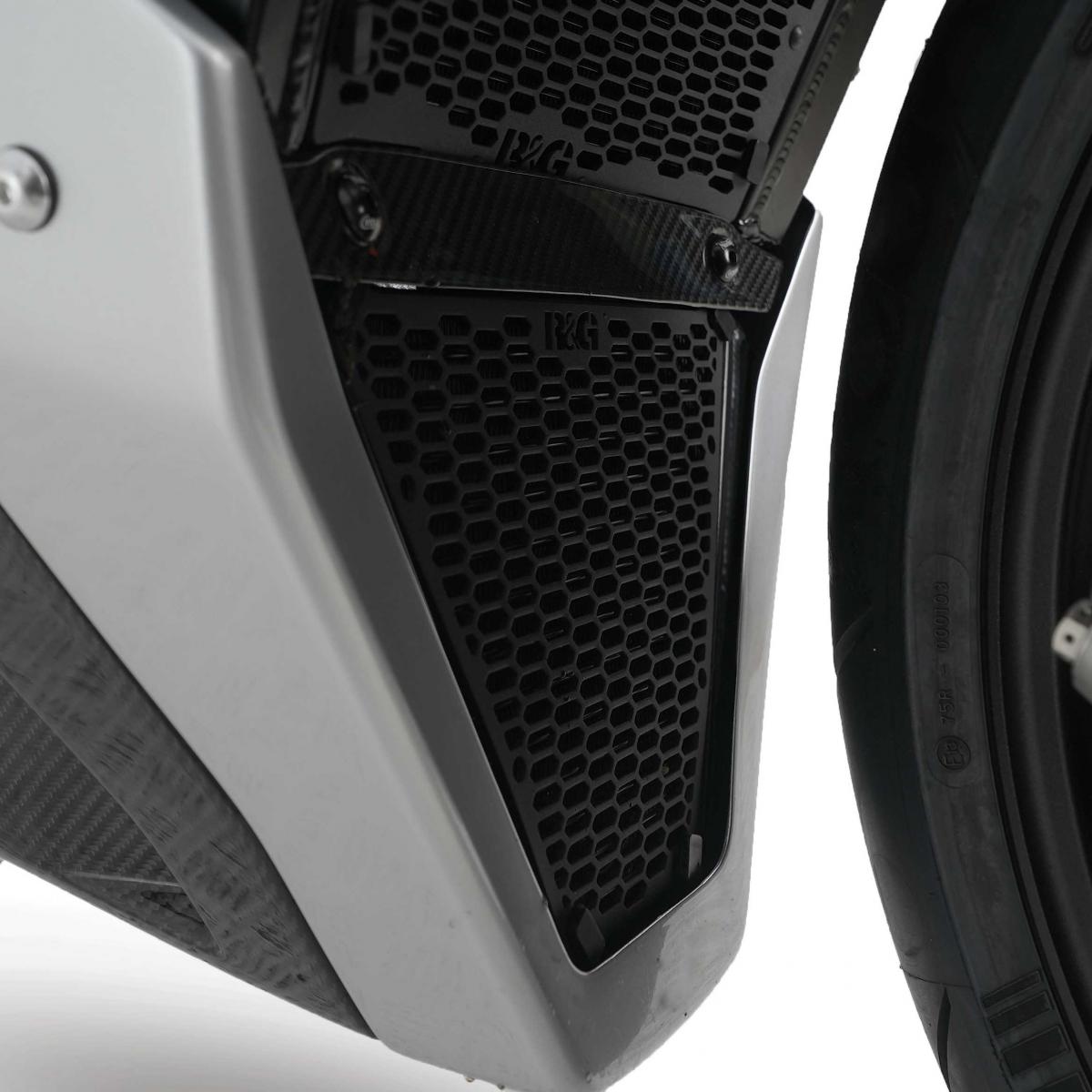 Våra PRO-oljekylarskydd har en ny geometrisk "hexa"-design som ger bättre luftflöde. R&G PRO-oljekylarskydd är tillverkade av ett enda stycke högkvalitativ lättviktsaluminium och erbjuder ett oslagbart förhållande mellan styrka och vikt. Lämplig för Norton V4SV 22-24V4CR 23-24